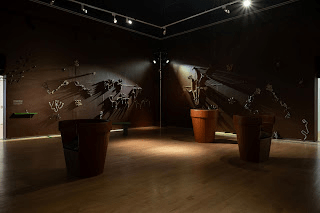 I walk into a much larger room, high ceiling and earthy burnt umber walls. It is unsettlingly lit. Spotlights cast light at unpredictable angles, not quite catching the art, pinning down the visitor, crafting spots of shadow and moments of blinding bright. In the centre of the room sit three giant flowerpots. They are seats, all facing different directions, allowing only one person to sit at a time. They dwarf the visitor. I am now mere inches tall, trapped in some sort of subterranean hall, an overgrown world of disturbing plant life. The walls seem alive.