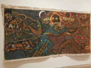In the next room, snippets of Uitoto myth contextualise the imagery of the artworks. We see works related to creativity, to agriculture, to creation. One stand out is Origin of the Force. This work was created specifically for the exhibition. Is the front and centre use of an English word – ‘eclipse’ – an exercise in pandering to an Anglocentric audience? I would argue not, since the exhibition will be later shown at Musee Universitario del Chopo and the Museu de Arte de Sao Paulo.