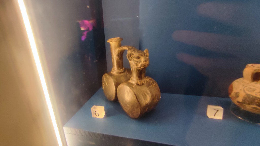 Beyond the Giant Cat, we find a few cabinets of cat-related artefacts from across the museum’s collection. They are presented with little info – beyond provenance – but encourage us to think about how we interact with cats. A particular favourite of mine is the double chambered Chima-inka 15thC bottle.