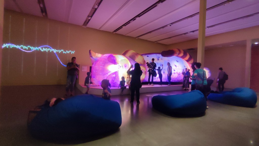 Rounding the corner we see the main attraction. A gigantic installation, a huge inflated and articulated sculpture replete with purring sounds and a chest that rises and falls as the creature sleeps and dreams. The ginormous cat has a beautiful sunset, watercolour-esque palette, through which light is shone, illuminating the entire room in sleepy yellows and purples. We are invited to interact with it, as we would a cat. Petting, stroking, scritching. And many are. The space is full of parents and young children, many of whom are stood on the platform upon which the installation sits, their faces pressed up against its surface, listening to it purr. It does feel very alive and very cosy. Very Ghibli-esque and highly Cat Bus inspired.