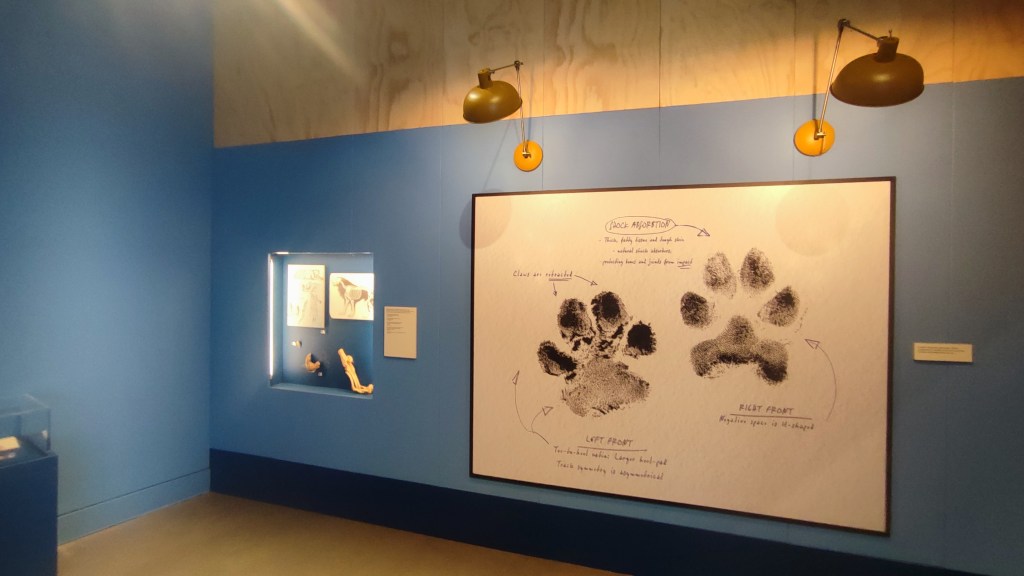 In the next room we see a mix of images related to the fiction, and objects from the museum that support it. For example, bones from big cats are shown near to an x-ray of the giant cat. The exhibition is sparse with information and refined in the objects it presents. By reducing the amount of objects shown, each one becomes more exciting, and more likely to draw in the younger audience.
