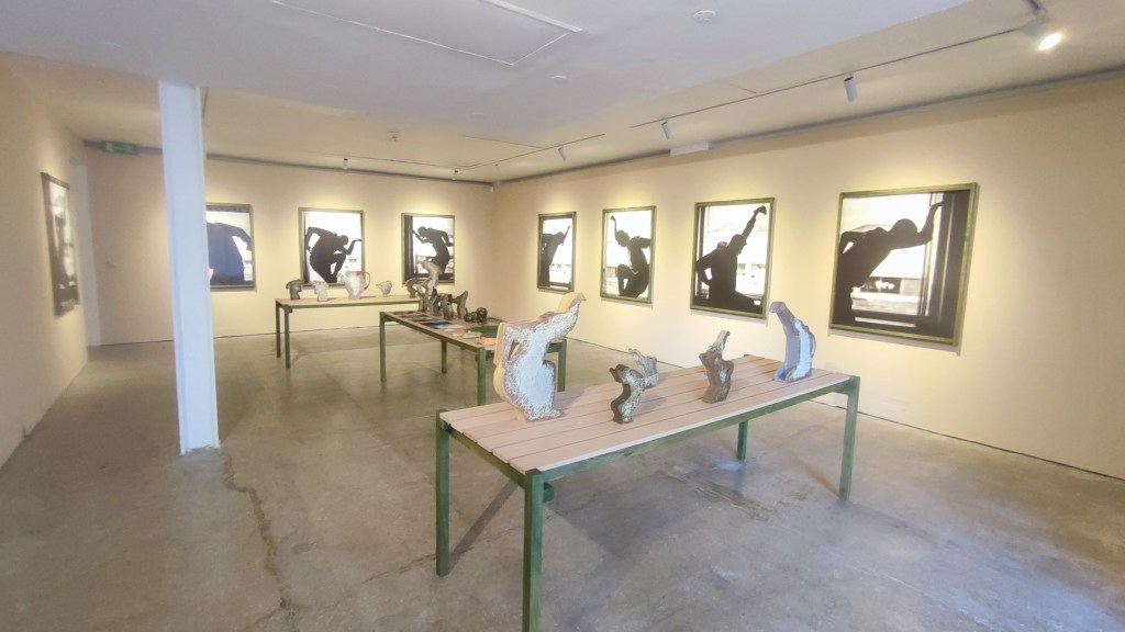 Here, the exhibition very clearly comes together. Large prints of silhouetted photos line the wall, spaced out and hung at the same height. In the centre, ceramics sit on workbenches. They are stood upright. Direct parallels between the photographs and the teapots are stunningly clear.