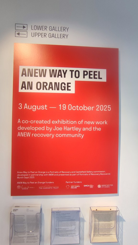‘ANEW Way To Peel An Orange’ is co-curated by Joe Hartley and the ANEW recovery community. It, much like Recoverist Curators, has been commissioned by Portraits of Recovery, through the CHAORDIC programme. It too is framed around the Recoverist – ‘recovery + activist’.