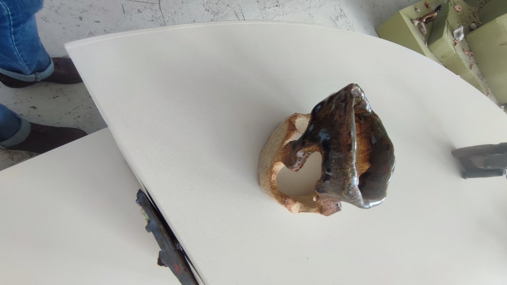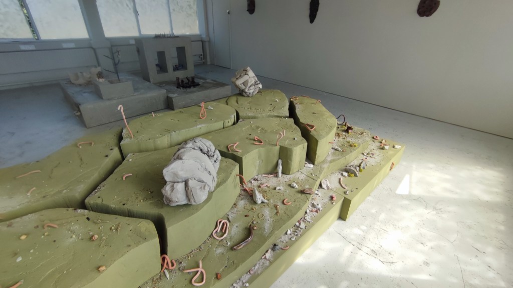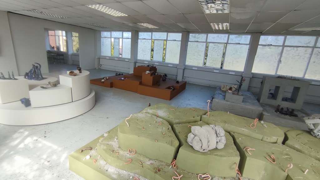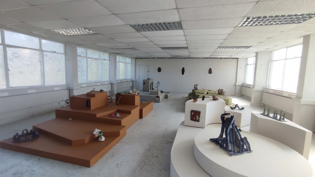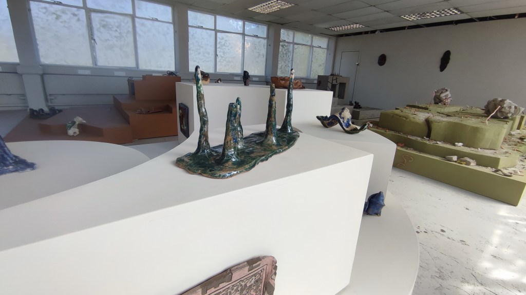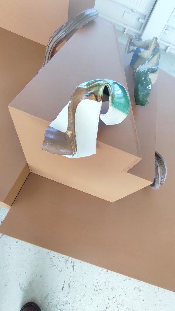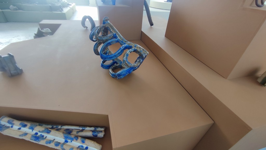 The room is gorgeous. Four stations create distinct spaces, in conversation with one another. Eason uses ceramics to explore neurodivergence, embodiment, dysmorphia, and instability. Referring to the text, each space explores a difference facet of being and feeling. Yet, forms and shapes are shared between these spaces. While they are sequenced numerically, I feel that the exhibition invites a far more non-linear route to exploration.