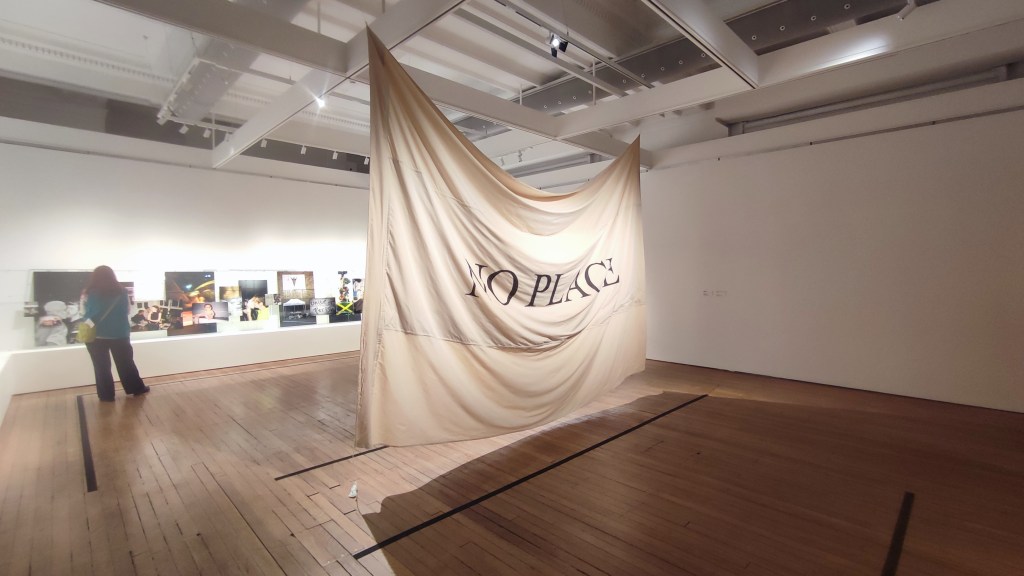 It is very – and I mean very – Adam Curtis. The use of potent and politically charged images accompanied by a rotating soundscape of often dissonant sounds amplifies the depth of both audio and visuals. Predominantly a photographer, their space is bisected by an attention grabbing and deceptively (?) simple banner. No Place / For Violence. Each half of the phrase dominates a separate side. It is the sort of work that a lot can be said about, yet, in isolation, says little. In the context of post-January 6, with the uptick of violence in America, the riots of Britain’s summer, it has potency. By putting the phrase loud and clear, it forces a viewer to step back and actually consider the content of the aphorism.