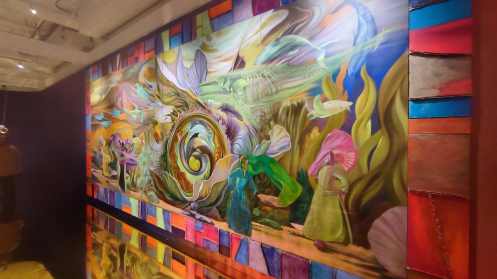 Standing for a while, I listen to the voices coming from the shells. They perform an exert of poetry. A rather disturbing, vivid, and affecting work on the climate disaster and the disappointment and fury of the planet in the face of human ineptitude and culpability. It is strong. The content of the words creates a fun dissonance with the floating and beautiful nature of the dreamscape. Out of all of the artists, I could easily see prints of Zadie’s work populating the walls of houses.