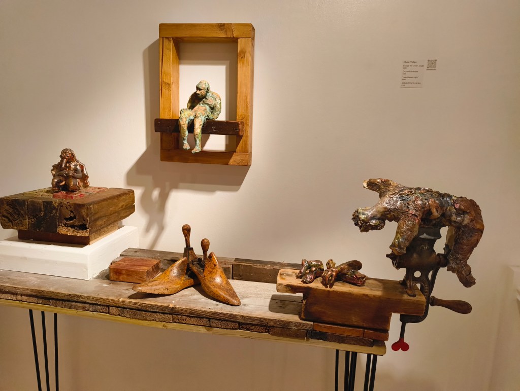 Chris Phillips pointedly displays his works on a cobbler’s workstation. These strange homunculi appear as if caught in the act of their own creation. Visceral fleshly colours mix with metallic patinas, a blend of the biological and mechanical. There is something mischievous, something Frankensteinian, here.
