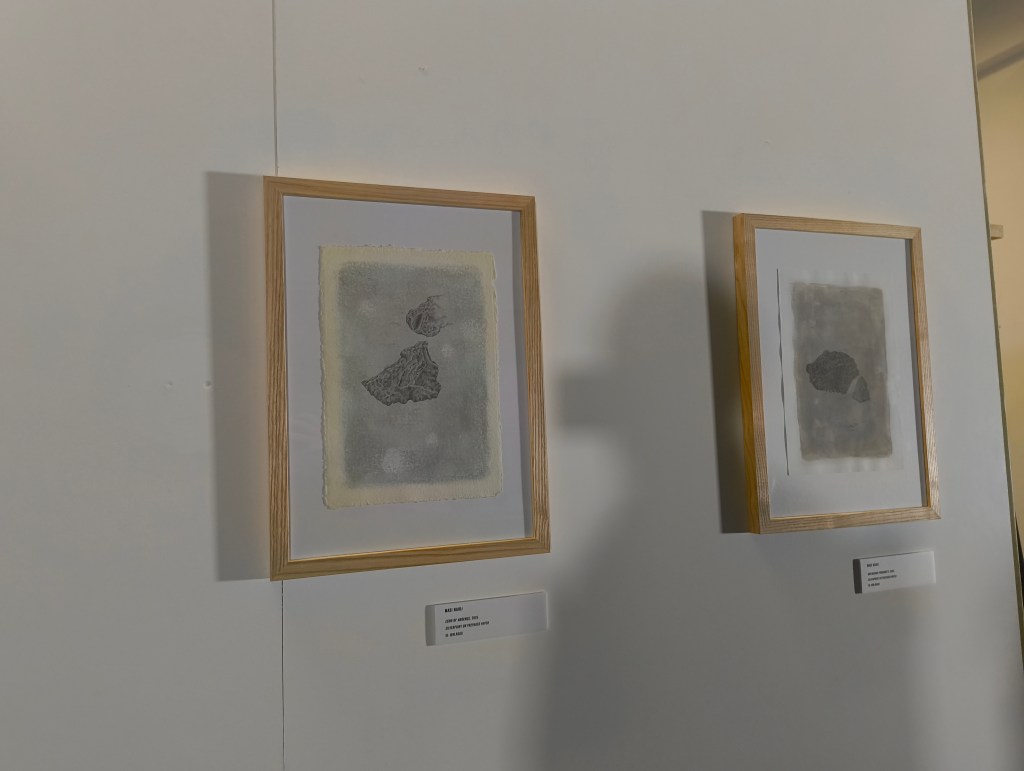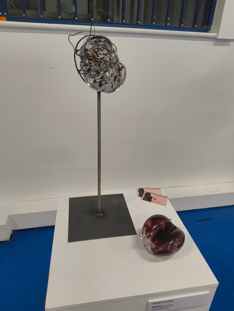 Expectedly, I am drawn to the sculpture. Madison Claire Sprague’s ‘Mother’ swiftly becomes my favourite work of the night. A nautiloid, foetal, shape – repeated both with wire suspension and without – speaks to notions of birth, to creation. Indeed, to making and mending. The glass construction is incredible, filled with mottled colours.