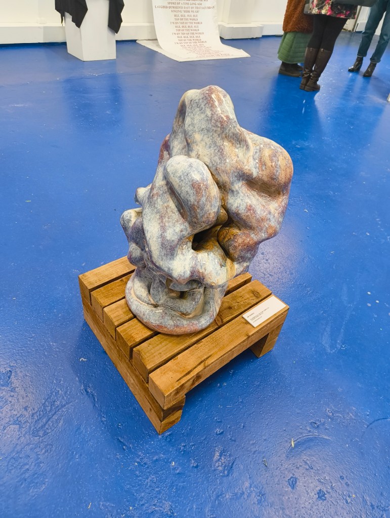 Before seeing the title, I note how Amy Bradnock’s Moore-esque sculpture seems slumped into itself. A tired looking bulging mass of clay, baked and glazed into place. It is with joy that I find that it is entitled ‘The Entangled Self Collection: Slumped’