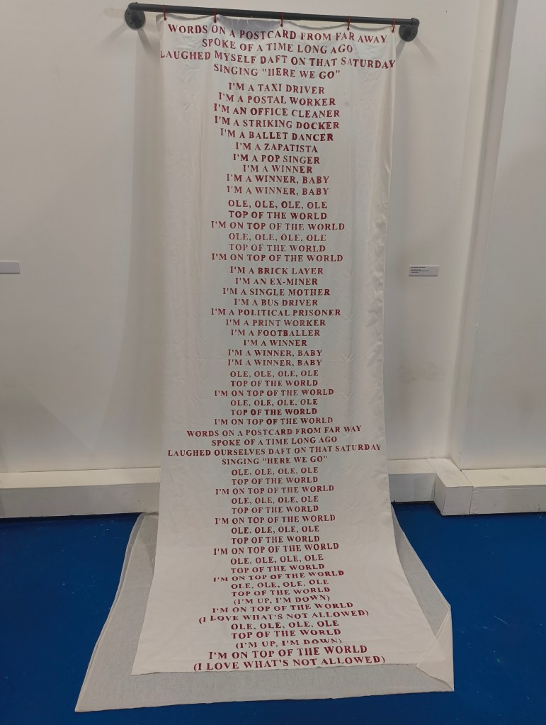 The poster piece – the one I would use to market the exhibition, is Molly Josephine Alabama Carnell’s text-based work, recanting football chants in a hypnotic fashion. Its size and tactility gives an uncanny weight to its words, the repetition sinking its claws into a viewer.