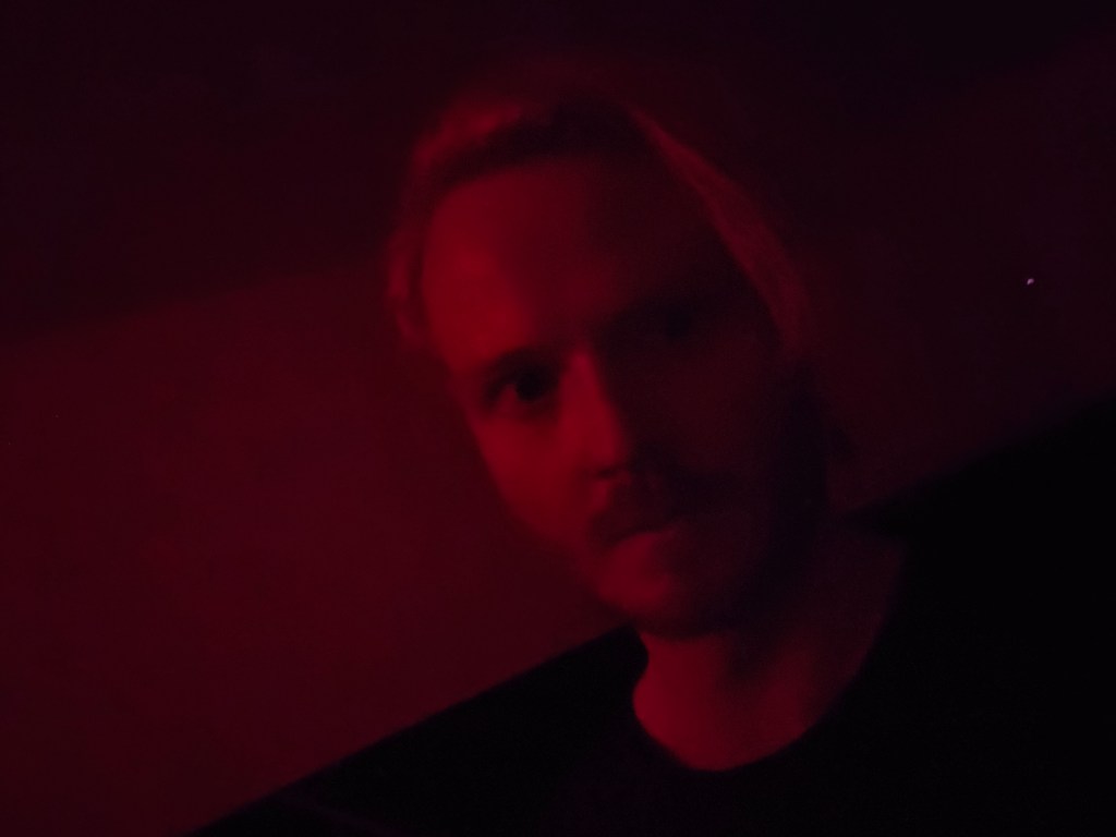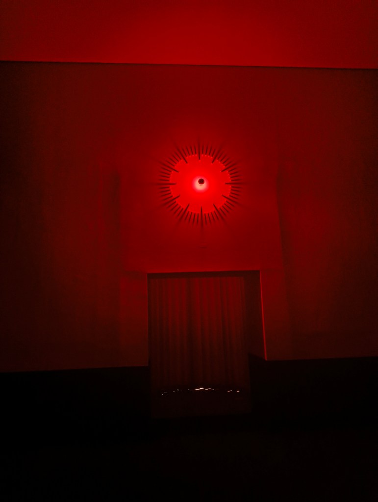 I have entered a different space. A different state. It is dark, almost completely but for a faint red glow from behind me. Turning around, there is a clock-face, illuminated from behind. It has no hands, nor numbers, only twelve demarcations. It’s central node transforms it perhaps into an eye. It is the only consistent light source. A naive reading sees this room akin to a cinema, perhaps, with felt lined walls and near-darkness.