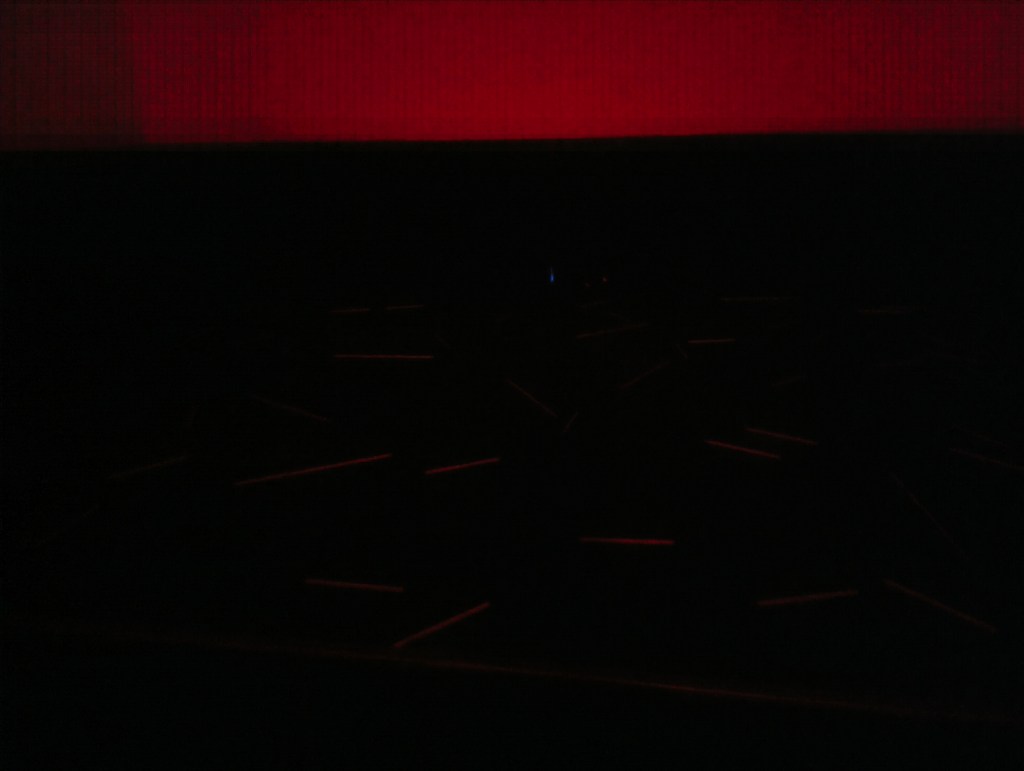 Beyond a ramp, that snatches back on itself, slowly descending deeper into the space, is the only other thing here. A number of bars – tubes of light – are spaced out on the floor, seemingly at random. They intermittently flash red, and are accompanied by a resounding clack. These bursts of light and noise are few and far between, and for extended periods of time, I am left alone in the dark, hoping that no one else is in here with me, waiting.