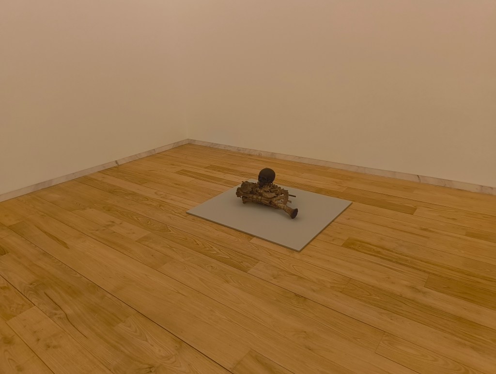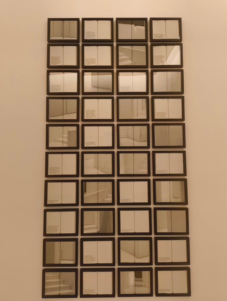 There are plenty more artworks within this space, however, in my growing discomfort and ever increasing sense of being watched, I neglected to take detailed notes, nor photographs. One room simply has a large sheet of glass, mounted diagonally, bisecting the room in an unintuitive angle. A bronze cast of a dismantled skeleton, skull sat on top, sits in the middle of the floor of another space. A memento mori. A disinterred grave. Books, each trapped within their own individual frames, alternate between vivid poetry and geometric, architectural forms. Even the stairwells seem sinister.