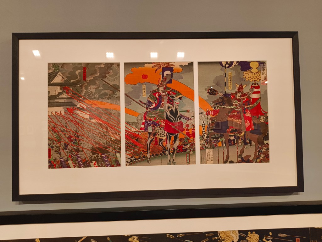 A particularly interesting detail is the depiction of gunfire during the conquest of shikoku, by artist Utagawa Yoshitora. The cross cultural influences of western style fire-arms, introduced in the 16th C by the Portuguese, with Samurai armor paints a complex picture of violence, captured in vivid reds almost absent from the previous rooms pre-occupation with water.