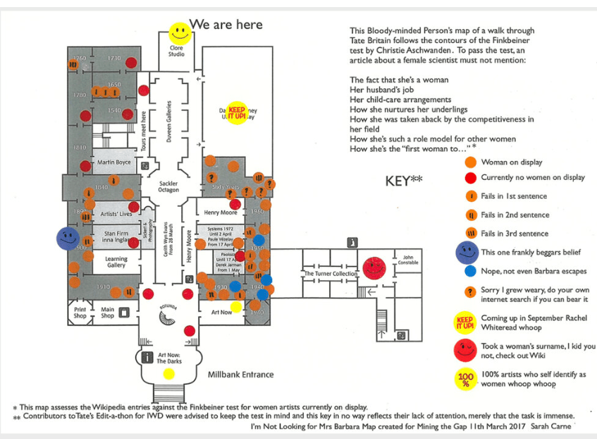 I use the example of Sarah Carne’s artwork I’m Not Looking for Mrs Barbara (2017). Rooms are marked based on whether they feature female artists, and whether the artists are described predominantly in relation to men. This outside intervention re-shapes the Museum Space of Tate Britain around a feminist question. Anyone using this map will encounter museum space differently than those using the regular map.