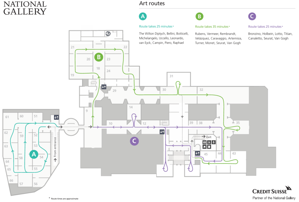 Another potentially problematic use of trails is the use of arrows, as seen in this National Gallery map from 2021. Here, the map suggests a correct and sequential route through the gallery. Accompanying the theory that architecture can create pathways, here, maps also create pathways, simplifying and smoothing out complex space.