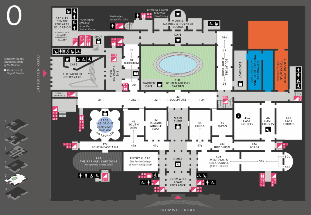 Looking at this map of the V&A from 2020, we can see that the footprint of the museum is shown as a dark shadow. In its isometric cross section, we can see areas which are to be considered the museum, and areas which are inaccessible.